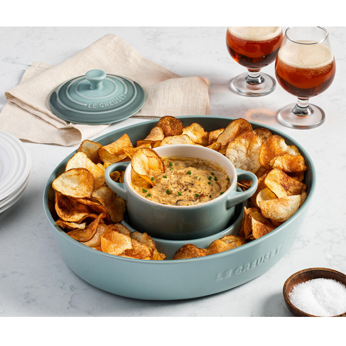 Transform your next gathering with the Signature Oval Chip & Dip Platter, the ultimate blend of beauty and function. Thoughtfully designed, this versatile platter features a generous dip bowl perfect for holding your favorite dips, garnishes, or spreads. It’s also sized to cradle a 24 oz. Mini Cocotte, offering even more versatility for your presentation. The spacious outer bowl is ideal for serving everything from crispy chips to fresh fruits and vegetables, artisanal cheeses, or oysters on the half shell over ice. Crafted from premium stoneware in our irresistible colors, each platter is finished with a vibrant glaze that complements any décor. Add a sophisticated flair to any table, ensuring your gathering is nothing short of extraordinary.
